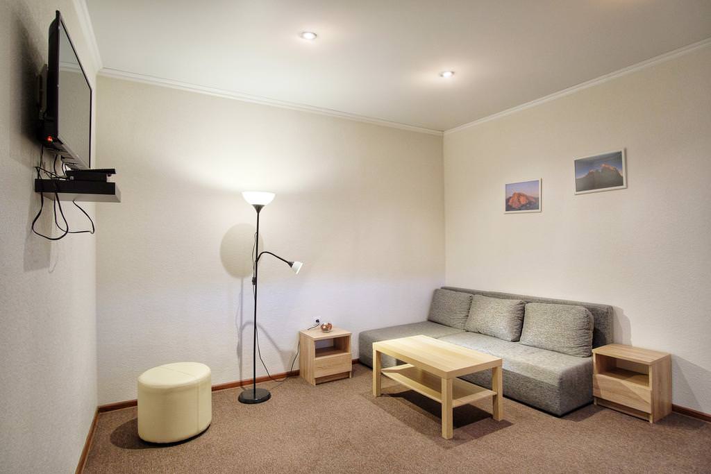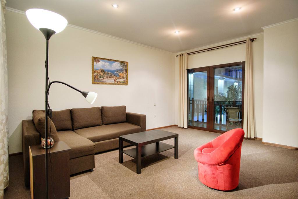 .Двухкомнатный номер с гостиной. Просторный номер площадью 48 кв.м. Кровати с ортопедическими матрасами. В гостиной раскладной диван. В ванной комнате есть фен и гигиенические принадлежности. Бесплатный Wi-Fi и ТВ. Кондиционер. Светонепроницаемые шторы black-out. Сейф, Холодильник *Возможно разместить доп.место